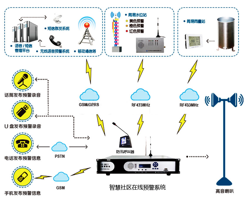 智慧社區在線(xiàn)預警系統由無(wú)線(xiàn)預警廣播、無(wú)線(xiàn)降雨告警器、水位報警器組成。